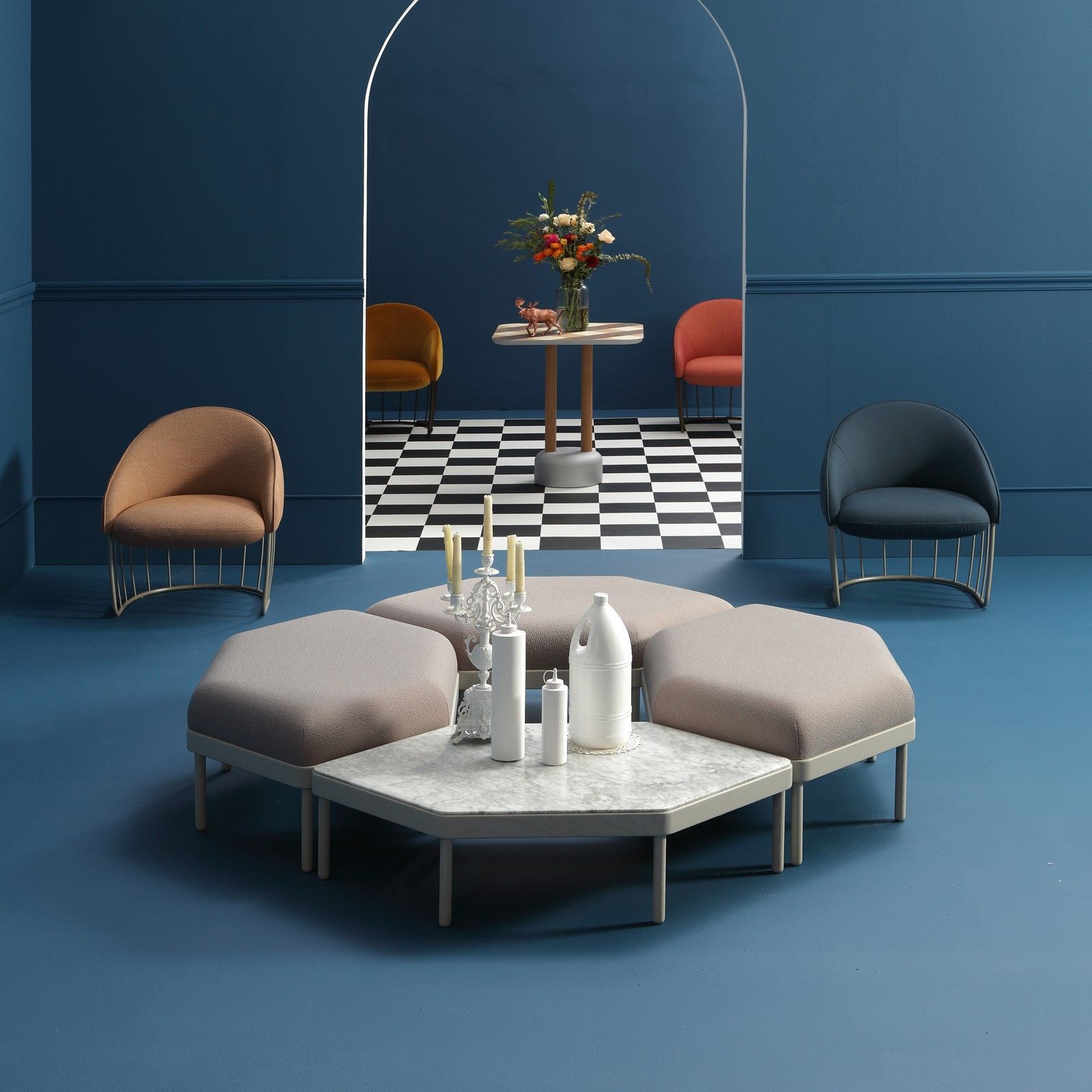 Mosaico is a puzzle that can be used to solve a range of different spatial constraints. The bases are made of ash and marble or wooden tops can be fitted as well as upholstered seat cushions.